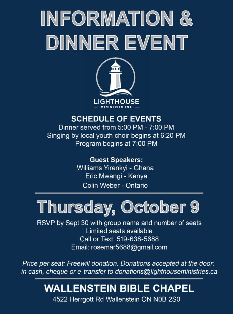 Come out to hear volunteers share about their experiences in Ghana and new updates on Lighthouse Ministries International, including an exciting new mission in Kenya.